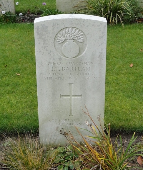 De 24-jarige Guardsman John Thomas Bartlam was de zoon van John Bartlam en Lucy Bartlam-Hyatt. Hij trouwde met Gladys Baker en zij woonden in Nottingham. Hij was in 1939 in dienst getreden en ingezet in mei 1940 in de eerste oorlogshandelingen, maar ontsnapte uit Duinkerken. Daarna werd hij met zijn onderdeel actief bij de bevrijding na de invasie in Normandië. Hij trok op met de Guards maart/april 1945, via de route Winterswijk naar Enschede. Deze stad werd bevrijd op 1 april 1945 (1e Paasdag) en Duitse troepen trokken via Losser terug richting de Lutte Op 2 april kwamen terugtrekkende Duitsers met twee vrachtwagens vol munitie, twee veldkanonnen en geschut het centrum van De Lutte in en sloegen het daar in een gebouw op. De Engelsen van de Grenadiers Guards trokken op richtring Duitsland via de Bentheimerstraat. De ingesloten Duitse soldaten begonnen te schieten op de Engelsen, die met zwaar geschut terugschoten. Hierbij kwamen zeker meerdere Grenadier Guards om het leven. Bartlam overleed op 5 april, volgens de gegevens van de Commonwealth War Graves Commission ten gevolge van een ongeluk. Hij werd aanvankelijk begraven bij de Paasbergweg/ Bentheimerstraat in De Lutte. In 1947 werd zijn stoffelijk overschot overgebracht naar Jonkerbos War Cemetery. Op zijn graf staat de tekst: GOD'S GREATEST GIFT, REMEMBRANCE