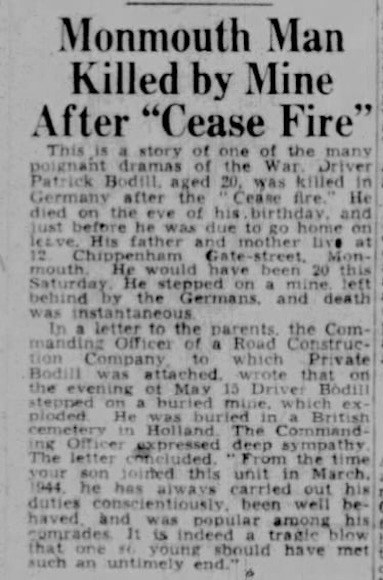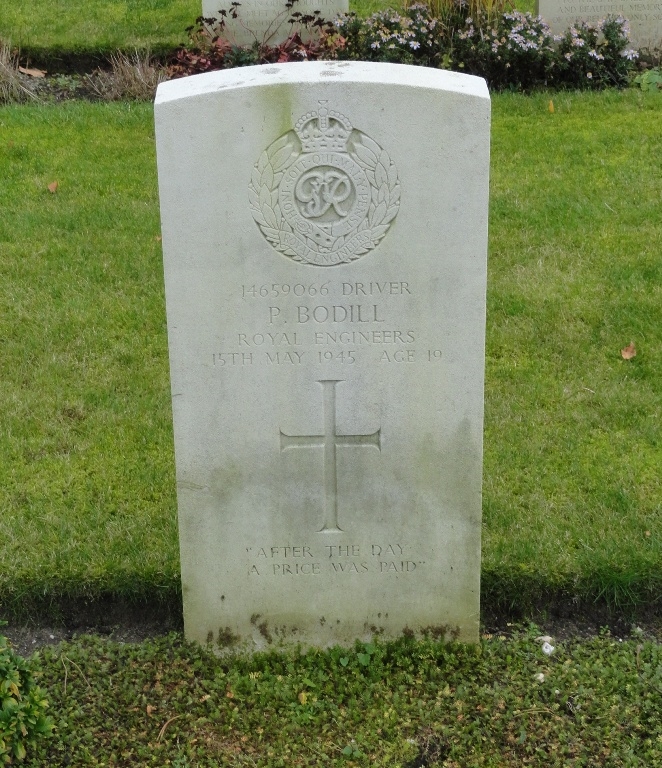 De 19-jarige Driver Pagtrick Bodill was de zoon van Richard Bodill en Gertrude May Bodill-Meredith. Hij diende bij de Royal Engineers en was betrokken bij het opruimen van mijnen. Hierbij kwam hij op het leven. Het is niet precies duidelijk waar dat gebeurde. Aanvankelijk werd hij begraven op de militaire begraafplaats Jonkerbos en in 1947 herbegraven op Jonkerbos War Cemetery. Op zijn graf staat de tekst: "AFTER THE DAY A PRICE WAS PAID"