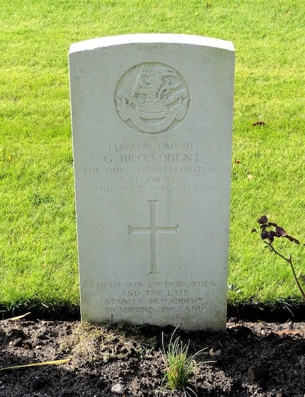 De 19-jarige Private Gordon Broadbent was de zoon van Stanley Broadbent en Dorothea Broadbent-Clifford is tegelijk met twee oudere kameraden van zijn 7th Bn., Private Hugh S. Thomson(33jaar) en Corporal Raymond Hemingsley(29 jaar), in Gendt ten Noordoosten van Nijmegen aan de overkant van de Waal op 2 april '45 om het leven gekomen. Het was de dag dat de Duitsers na zware gevechten uit Gendt verdreven werden en de bevrijding van Gendt een feit werd. Gordon werd aanvankelijk begraven in Lent, op de hoek Dorpsplein en Hortensiastraat en in 1947 herbegraven op de Britse militaire begraafplaats Jonkerbos in Nijmegen. Op zijn graf staat de tekst: