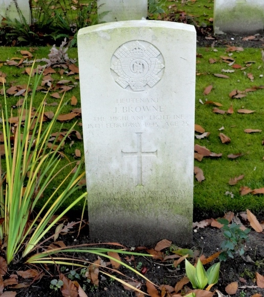 De 25-jarige Lieutenant John Browne was de zoon van Christopher Graham Browne en Agnes Gertrude Browne-Belcher en kwam uit Glasgow. Hij trouwde in 1941 met Helen May Thom en zij kregen een zoontje. Hij werd met zijn onderdeel ingezet bij de opmars richting het Rijnland en raakte bij gevechten, waarschijnijk in de omgeving van Afferden (Limburg) zodanig gewond dat hij overleed op 18 februari. Hij werd aanvankelijk begraven op de voorlopige militaire begraafplaats Jonkerbosch en na de oorlog herbegraven op Jonkerbos War Cemetery. Op zijn graf staat de tekst: HE LAID THE WORLD AWAY; POURED OUT THE RED SWEET WINE OF YOUTH; THE YEARS TO BE
