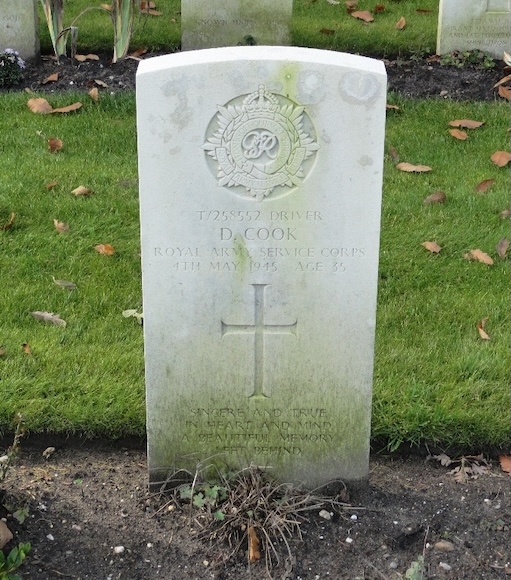 De 35-jarige chauffeur Donald Cook was de zoon van Arthur James Cook en Annie Cook-Edwards. Hij trouwde in 1933 met Jessie May Bentley. Hij diende bij het onderdeel dat verantwoordelijk was voor het vervoer van legeronderdelen, voedsel en essentiele benodigdheden voor de oorlogvoering. Hij overleed op 4 mei. Het is vooralsnog niet duidelijk waar en door welke oorzaak. Aanvankelijk werd hij begraven op de militaire begraafplaats Jonkerbos en werd in 1947 herbegraven op Jonkerbos War Cemetery. Op zijn graf staat de tekst: SINCERE AND TRUE IN HEART AND MIND A BEAUTIFUL MEMORY LEFT BEHIND