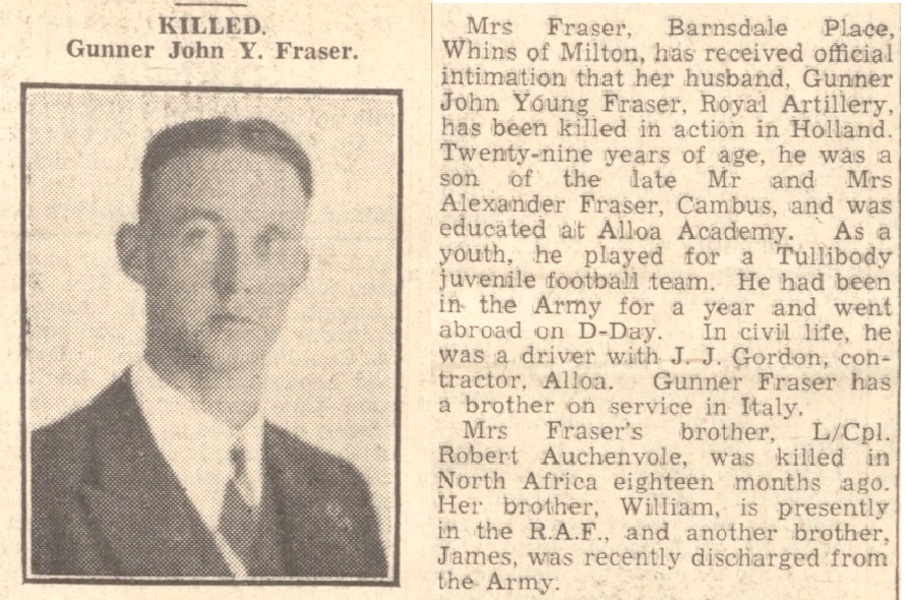 De 29-jarige Gunner John Young Fraser was de zoon van Alexander en Margaret Young Fraser. Hij was gehuwd met Catherine Fraser en woonde in Whins of Milton (Stirlingshire, UK). Hij sneuvelde op 10 december. Het is vooralsnog niet duidelijk waar dat gebeurde. Hij werd aanvankelijk begraven op de voorlopige militaire begraafplaats Jonkerbosch en na de oorlog herbegraven op het Jonkerbos War Cemetery.