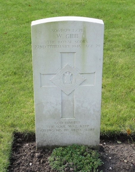De 29-jarige Lance Corporal William Gibb was de zoon van James Gibb en Janet Gibb Brown Gibb-Nielson. Hij was met zijn onderdeel betrokken bij operatie Veritable en waarschijnlijk in de omgeving van Afferden toen hij zwaar gewond raakte. Hij overleed op 22 februari en werd aanvankelijk begraven op de Britse militaire begraafplaats Marienbosch. In 1947 werd hij herbegraven op Jonkerbos War Cemetery. Op zijn graf staat de tekst:
