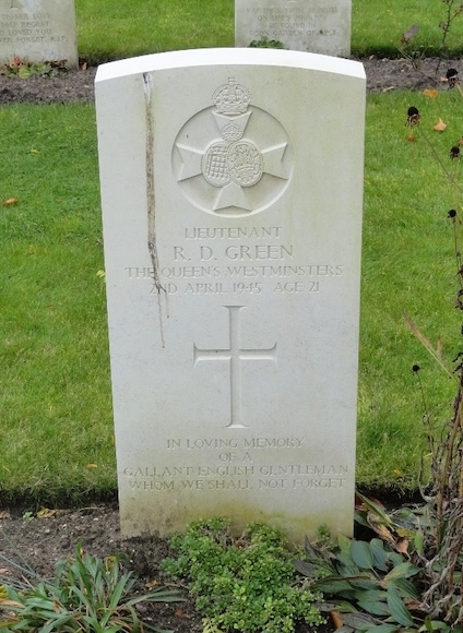 De 21-jarige Lieutenant Roger Denis was de zoon van Harry Whitson Green en Hilda Bertha Green-Wire. Hij volgde zijn opleiding aan de Christ's Hospital School (1934 - 1940) in Horsham, West Sussex. Hij werkte daarna bij de Hoare's Bank in the City of London vanaf april 1940. Roger Green ging in militaire dienst in januari 1942 bij het 12th Battalion King's Royal Rifle Corps, dat deelnam aan de landing in Normandie.