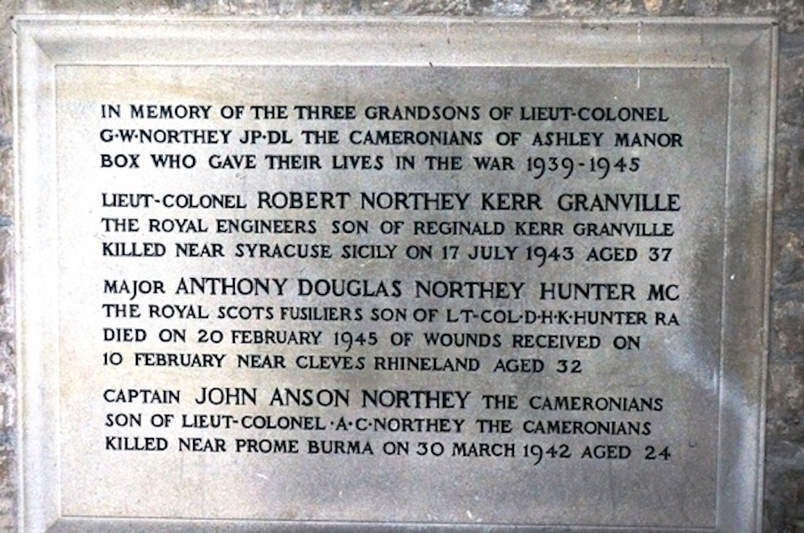 In de St. Thomas a Becket kerk in Box is een plaquette aangebracht door de grootvader Lieutenant-Kolonel G.W. Northey waarop de namen van drie kleinzoons, onder wie van Majoor A.D. Northey Hunter, die tijdens de Tweede Wereldoorlog zijn omgekomen.