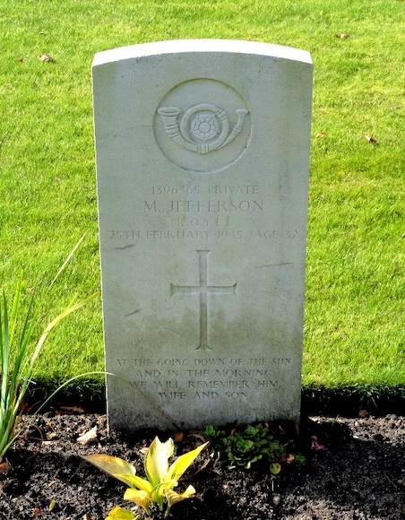 De 32-jarige soldaat Matthew Jefferson was de zoon van Matthew en Elizabeth Ann Jefferson. Hij was getrouwd met Ada Ethel Jefferson. Zijn onderdeel had de opdracht het bruggenhoofd bij Nijmegen en bij de Waalbrug te verdedigen. Op 25 februari sneuvelde hij. Het is vooralsnog niet duidelijk waar en onder welke omstandigheden dat gebeurde. Hij werd in Lent op de kleine militaire begraafplaats begraven. In 1947 werd hij herbegraven op Jonkerbos War Cemetery. Op zijn graf staat de tekst: