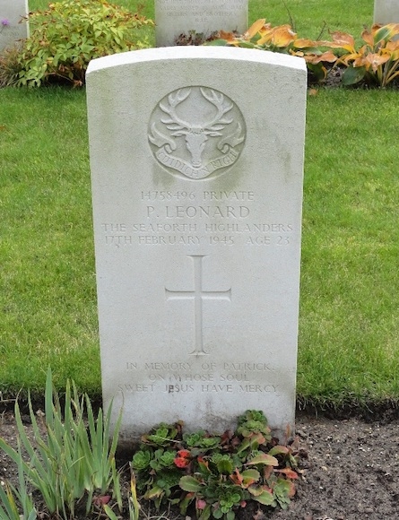 De 23-jarige soldaat Patrick Leonard was de zoon van Mr. en Mrs. Felix Leonard en kwam uit Boho, Co. Fermanagh (Noord-Ierland). Zijn onderdeel werd ingezet bij de opmars naar het Rijnland en tijdens de gevechten werd hij ernstig gewond. Het is vooralsnog niet duidelijk waar en wanneer dat precies gebeurde. Hij overleed aan zijn verwondingen op 17 februari en werd aanvankelijk begraven op de Britse militaire begraafplaats Marienbosch. In 1947 werd zijn stoffelijk overschot overgebracht naar het Jonkerbos War Cemetery. Op zijn graf staat de tekst: