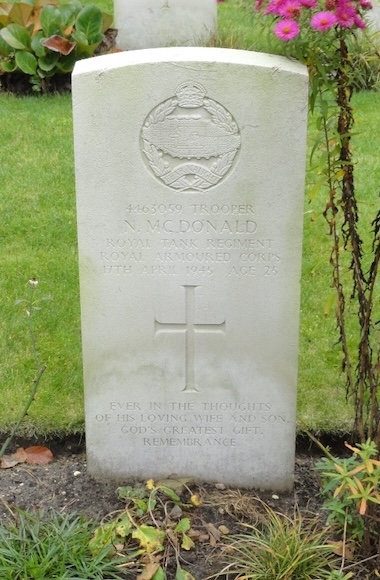 De 25-jarige Norman McDonald was de zoon van James McDonalden Nora of Norah McDonald- Simpson. Hij trouwde in het voorjaar 1939 met Lily C R Moodie en zij kregen één zoon. Hij overleed op 17 april aan zijn verwondingen. Het is vooralsnog niet duidelijk waar en onder welke omstandigheden hij deze opliep. Hij werd aanvankeliojk begraven op de oude militaire begraafplaats Jonkerbosch en in 1947 herbegraven op Jonkerbos War Cemetery. Op zijn graf staat de tekst: EVER IN THE THOUGHTS OF HIS LOVING WIFE AND SON. GOD'S GREATEST GIFT, REMEMBRANCE