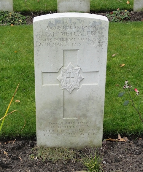De 25-jarige Guardsman John Howard Metcalfe was de zoon van Matthew en Mary Metcalfe, en kwam uit North Ormesby (Middlesbrough, Yorkshire). Zijn onderdeel was betrokken bij de opmars richting Rijnland in het kader van Opertie Veritable. John Howard Metcalfe stierf op 27 maart. Het is voorlsnog niet duidelijk wat de doodsoorzaak was. Hij werd aanvankelijk begraven op de Britse militaire begraafplaats Marienbosch en in 1947 herbegraven op Jonkerbos War Cemetery. Op zijn graf staat de tekst: