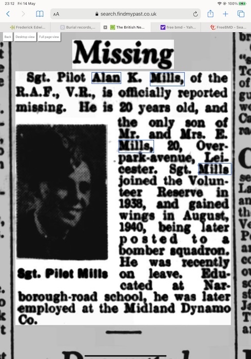Sergeant Alan Kingsley Mills was de zoon van Frederick Edwin Herbert Mills en Lily Mills en wkam uit Leicester.