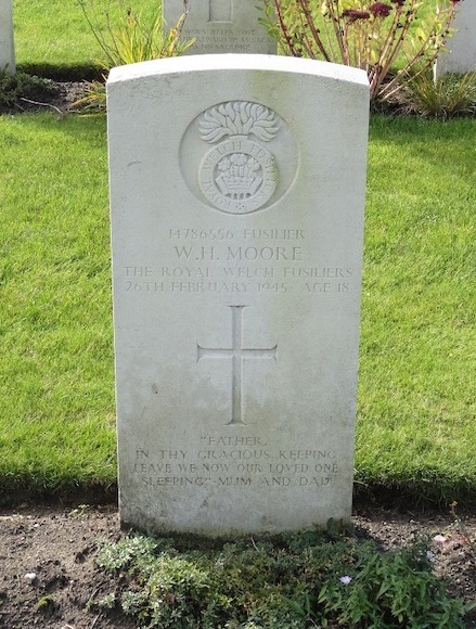 De 18-jarige fusilier William H. Moore was de zoon van William Henry Moore en Lily May Moore-Thorne en kwam uit Milton, Portsmouth. Hij was met zijn onderdeel ingezet bij de opmars richting Rijnland in het kader van Operatie Veritable. Bij gevechten raakte hij zo ernstig gewond dat hij op 26 februari overleed. Het is vooralsnog niet duidelijk waar dat precies gebeurde. Hij werd aanvankelijk begraven op de Britse begraafplaats Marienbosch en in 1947 herbegraven op Jonkerbos War Cemetery. Op zijn graf staat de tekst: "FATHER, IN THY GRACIOUS KEEPING LEAVE WE NOW OUR LOVED ONE SLEEPING " - MUM AND DAD