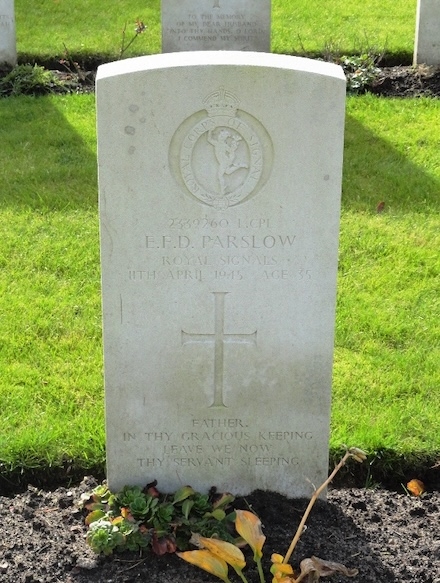 De 35-jarige Lance Corporal Edward Francis Donald Parslow was de zoon van William en Ellen Jane Parslow. Hij trouwde in 1930 met Maggie Louise Fox en hij woonde met zijn gezin in Aylesbury. Volgens de gegevens van de Commonwealth War Graves Commission kwam hij om het leven als gevolg van een ongeluk. Het is niet duidelijk waar dat gebeurde. Aanvankelijk werd hij begraven op de militaire begraafplaats Marienbosch en in 1947 herbegraven op Jonkerbos War Cemetery. Op zijn graf staat de tekst: FATHER, IN THY GRACIOUS KEEPING LEAVE WE NOW THY SERVANT SLEEPING