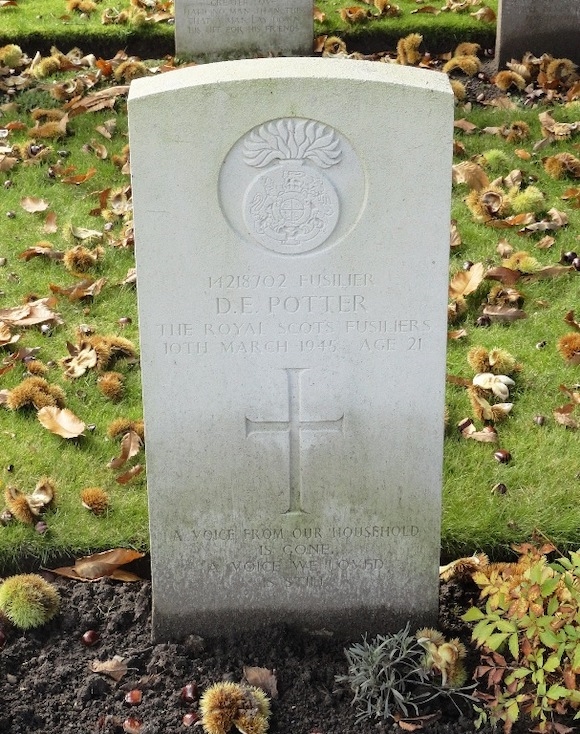 De 21-jarige fusilier Derek Edmund Potter was de zoon van Edmund Saul Fright Potter en Dora Lillian Potter-Armstrong. Hij was de kleinzoon van Mevrouw A. Armstrong. Waarschijnlijk groeide hij bij haar op omdat zijn moeder in 1929 overleed. Edmund was toen vijf jaar. Hij was met twee andere fusiliers van zijn onderdeel, William John Little en James Worton, bezig met een stormboot vanuit Nijmegen de Waal over te steken om vaste voet aan de grond te krijgen, maar door sterke Duitse weerstand mislukte dit. Zij kwam alledrie om het leven en zij werden begraven op de voorlopige militaire begraafplaats Jonkerbosch. In 1947 werden de stoffelijke overschotten overgebracht naar Jonkerbos War Cemetery.