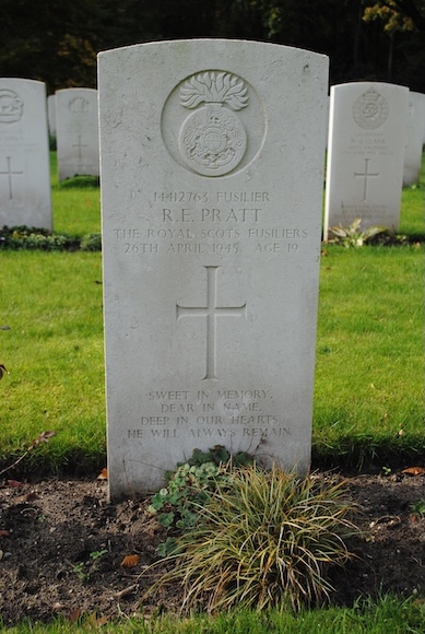 De 19-jarige schutter Ronald Ernest Pratt was de zoon van Albert “William” E A Pratt en Emily Louisa Pratt- Kneller. Zijn moeder stierf in 1937 en zijn grootmoeder, mevrouw C. M. Kneller was zijn voogd. Hij was met zijn onderdeel betrokken bij de hevige gevechten rond Renswoude in april 1945, de zogenaamde battle of Renswoude. Hij sneuvelde op 26 april. Aanvankelijk werd hij begraven in Wagenveld in een graf bij de weg naar Barneveld. In 1947 werd zijn stoffelijk overschot overgebracht naar Jonkerbos War Cemetery. Op zijn graf staat de tekst: