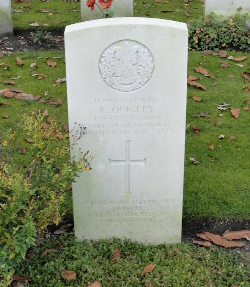 De 18-jarige Robert Quigley was de zoon van George en Florence Quigley uit Liverpool. Hij kwam om het leven op 17 februari '45. Waar en onder welke omstandigheden is ons niet bekend. Aanvankelijk werd hij begraven op de Britse begraafplaats Jonkerbosch en in 1947 herbegraven op Jonkerbos War Cemetery. Op zijn graf staat de tekst: IN EVERLASTING REMEMBRANCE OF BOBBIE,