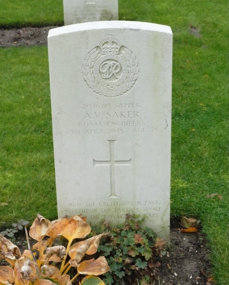 De 25-jarige geniesoldaat Albert Victor Saker was de zoon van William Samuel Saker en Catherine Mabel Saker-Fry. Hij had een tweelingzus, Joan. Saker was lasser van beroep en trad in 1939 in dienst. Hij diende bij de 157th Railway Construction Company, Royal Engineers, een specifieke eenheid binnen het ingenieurskorps van het Britse leger, gespecialiseerd in spoorweginfrastructuur. Waarschijnlijk werden hij en zijn collega Luitenant Norman Charles Clark bij de spoorlijn vanuit Arnhem/Zevenaar naar Emmerich/Kleef getroffen door Duits geschut. Beiden sneuvelden op 6 april en werden begraven bij een boerderij langs de spoorlijn in de buurt van Wehl (Gelderland). In 1947 werd zijn stoffelijk overschot overgebracht naar Jonkerbos War Cemetery. Op zijn graf staat de tekst: NOW THE BATTLE DAY IS PAST; NOW UPON THE FATHER SHORE LANDS THE VOYAGER AT LAST