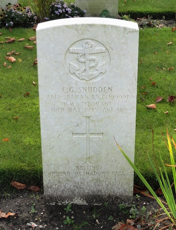 De 40-jarige Able Seaman Charles George Snudden was de zoon van Charles George Snudden en Ellen Snudden-Avis. Hij overleed aan de gevolgen van een hersenbloeding op 10 mei 1945. Aanvankelijk werd hij begraven op de militaire begraafplaats Jonkerbosch en in 1947 herbegraven op Jonkerbos War Cemetery. Op zijn graf staat de tekst: RESTING WHERE NO SHADOWS FALL