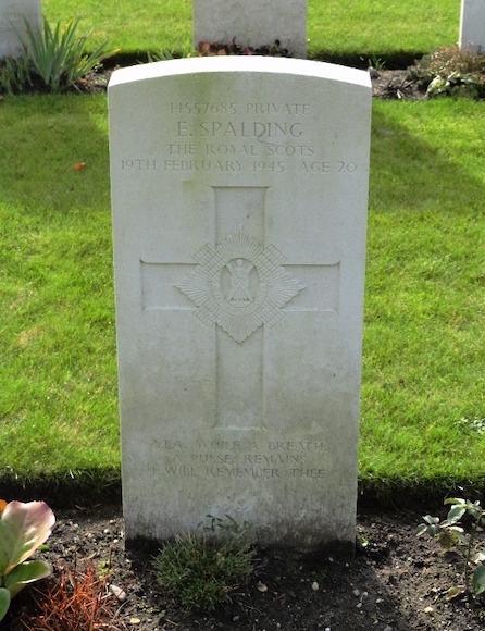 De 20-jarige soldaat Edwin Spalding was de zoon van Edwin Richard Spalding en Dorothy Alice Spalding-Clark. Zijn moeder stierf vlak na zijn geboorte en zijn grootmoeder bracht hem groot. Hij diende bij de Royal Scots, een onderdeel van het leger dat ingezet werd bij Operatie Veritable, de opmars naar het Rijnland. Hij raakte hierbij zo ernstig verwond, dat hij overleed. Het is vooralsnog niet duidelijk waar dat gebeurde. Aanvankelijk werd hij begraven op de Britse begraafplaats Marienbosch en in 1947 herbegraven op Jonkerbos War Cemetery. Op zijn graf staat de tekst: