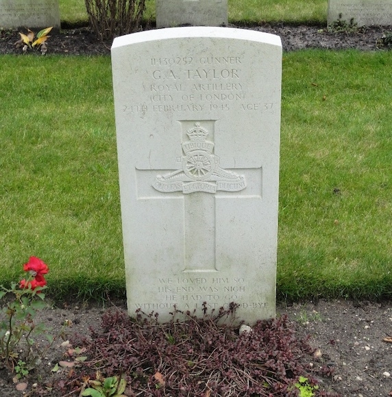 De 37-jarige gunner George Albert Taylor was de zoon van Walter John en Bridget Taylor en hij was getrouwd met Doris May Taylor. Hij sneuvelde op 24 feruari, waarschijnlijk bij gevechten tijdens de opmars richting Rijnland.Zijn onderdeel was met zwaar geschut daarbij betrokken. Hij werd aanvankelijk begraven op de oude militaire begraafplaats Jonkerbosch en in 1947 herbegraven op Jonkerbos War Cemetery. Op zijn graf staat de teskt: WE LOVED HIM SO HIS END WAS NIGH HE HAD TO GO WITHOUT A LAST GOOD-BYE