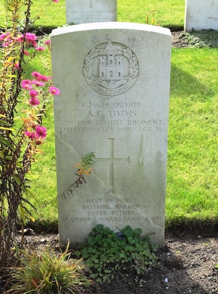 De 25-jarige soldaat Alfred Charles Timms was de zoon van Alfred Percy Timms en Jean Lydia Timms-Willes. Hij kwam uit Kensington. Zijn onderdeel werd ingezet met de opmars richting Rijnland. Hij werd ernstig gewond tijdens de gevechten. Vooralsnog is het niet duidelijk waar dat precies gebeurde. Op 17 februari overleed hij aan zijn verwondingen. Aanvankelijk werd hij begraven op de Britse militaire begraafplaats Marienbosch en in 1947 herbegraven op Jonkerbos War Cemetery. Op zijn graf staat de tekst: