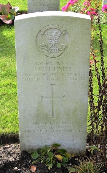 De 23-jarige soldaat James William Harold Unitt was de zoon van Andrew Unitt en Susan Unitt-Turley uit Old Hill, Staffordshire. James diende bij de Somerset Light Infantery en werd in februari ingezet bij de opmars richting het Rijnland. Tijdens de gevechten werd hij dusdanig ernstig gewond dat hij op 17 februari overleed. Aanvankelijk werd hij begraven op de Britse begraafplaats Marienbosch en na de oorlog herbegraven op Jonkerbos War Cemetery. Op zijn graf staat de tekst: HIS MISSION ENDED: CALLED HOME. HIS SOUL FOUND IN PEACE